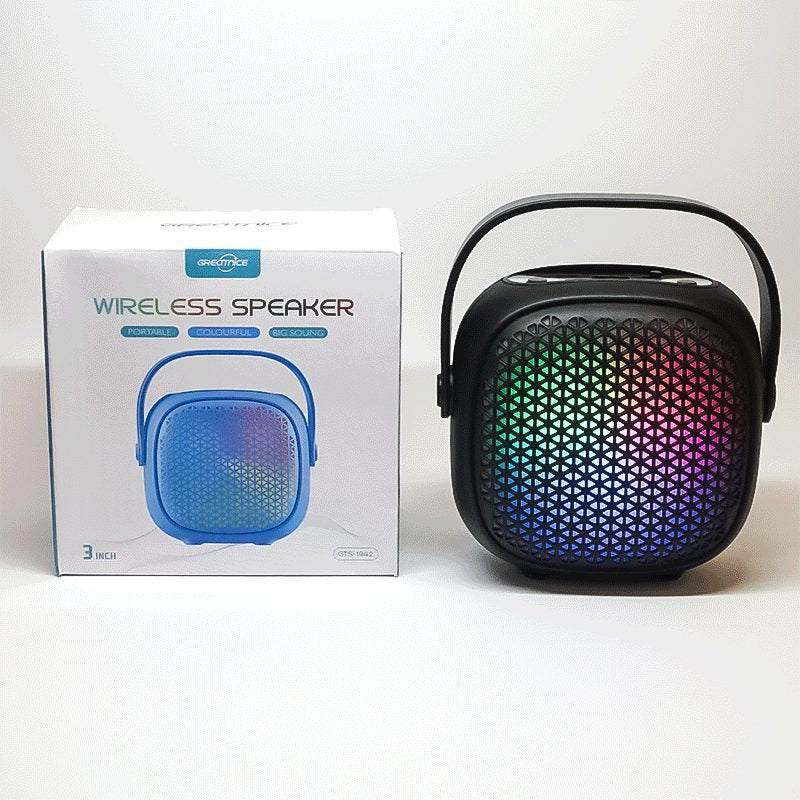 The GTS-1942 Bluetooth Speaker (also known as Greatnice GTS-1942) is a stylish 3-inch portable speaker with RGB LED lights, making it the ultimate choice for parties, outdoor activities, and travel. With its compact design, powerful sound, and multi-functional features, this wireless speaker is built for music lovers who want performance and portability in one device.